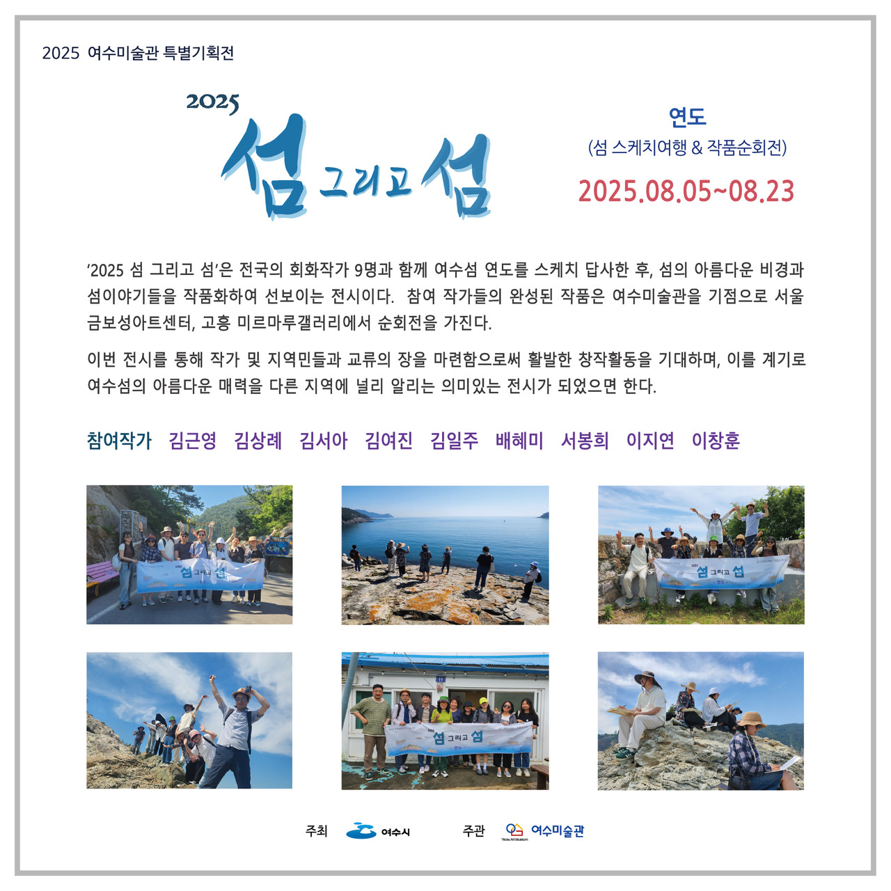 ‘2025 섬 그리고 섬’은 전국의 회화작가 9명과 함께 여수섬 연도를 스케치 답사한 후, 섬의 아름다운 비경과 섬이야기들을 작품화하여 선보이는 전시이다. 참여 작가들의 완성된 작품은 여수미술 관을 기점으로 서울 금보성아트센터, 고흥 미르마루갤러리에서 순회전을 가진다.